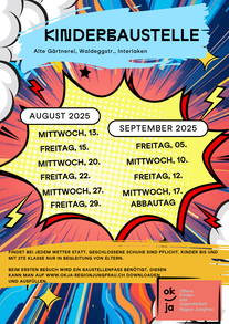 Die Kinderbaustelle ist jeweils am Mittwoch und Freitag von 13.30 - 16.30 Uhr geöffnet. Die genauen Daten können unten heruntergeladen werden.